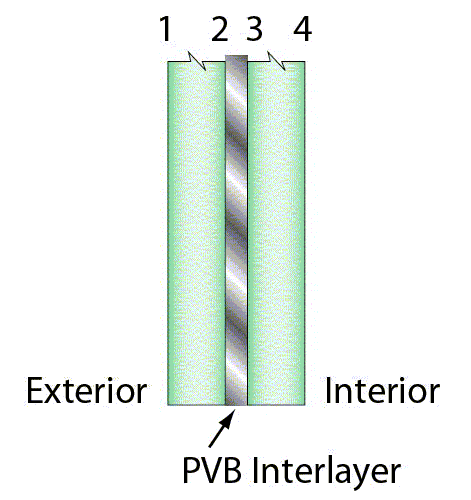 Laminated Glass is two or more panes of glass with one or more layers of PVB (Polyvinyl Butyral) sandwiched between them and treated. In case of glass breakage, the glass fragments remain adhered to PVB film reducing the risk of injury. This glass is also called Security Glass.